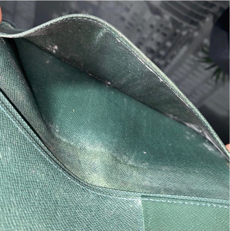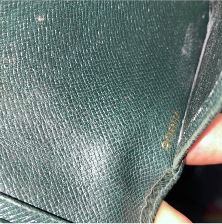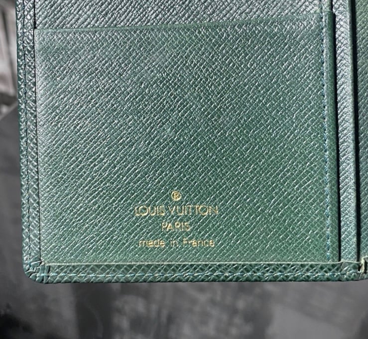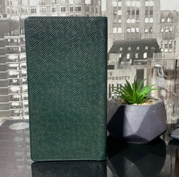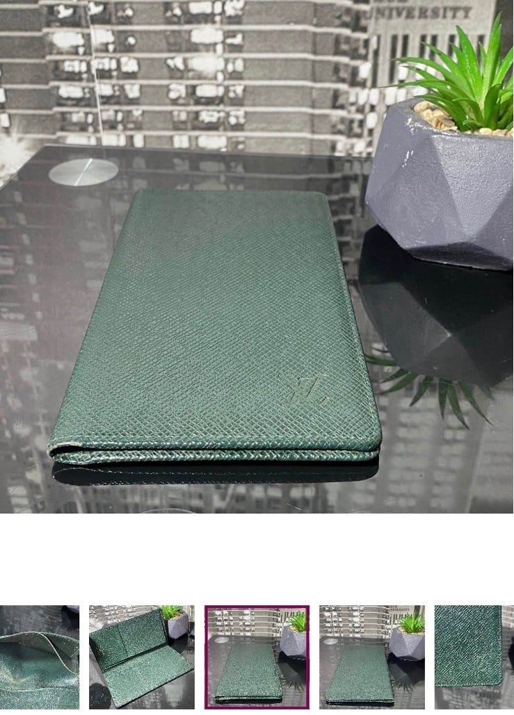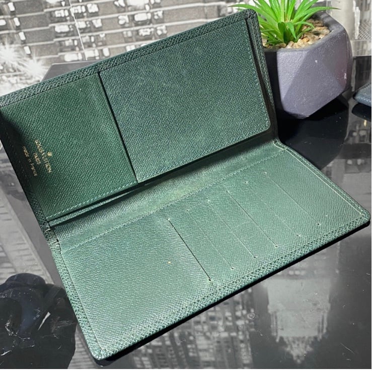 Authentic Louis Vuitton Taiga checkbook holder in preowned condition with some signs of wear. Six card slots, bill compartment, receipt/checkbook holder. Will fit most cell phones.
