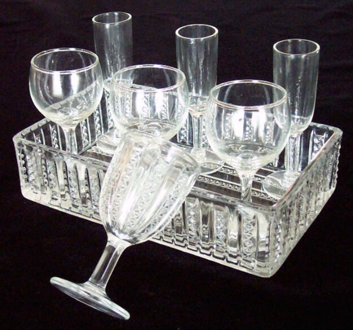 Circa 1930's. Offered is a unique way to serve your after dinner drinks. The tray and single matching crystal are period pieces with a "star" pattern pressed into each. Unfortunately, only the single glass remains, but we'll throw in 6 miniature cordials, as shown (3 each - 2 different shapes) for free!
